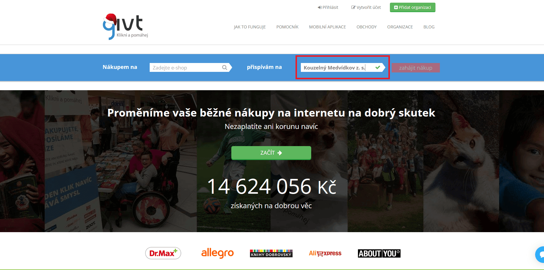 Ujistěte se, že v modrém poli (v obrázku v červeném rámečku), v sekci „přispívám na“, je vybrán náš spolek: Kouzelný Medvídkov z.s.
