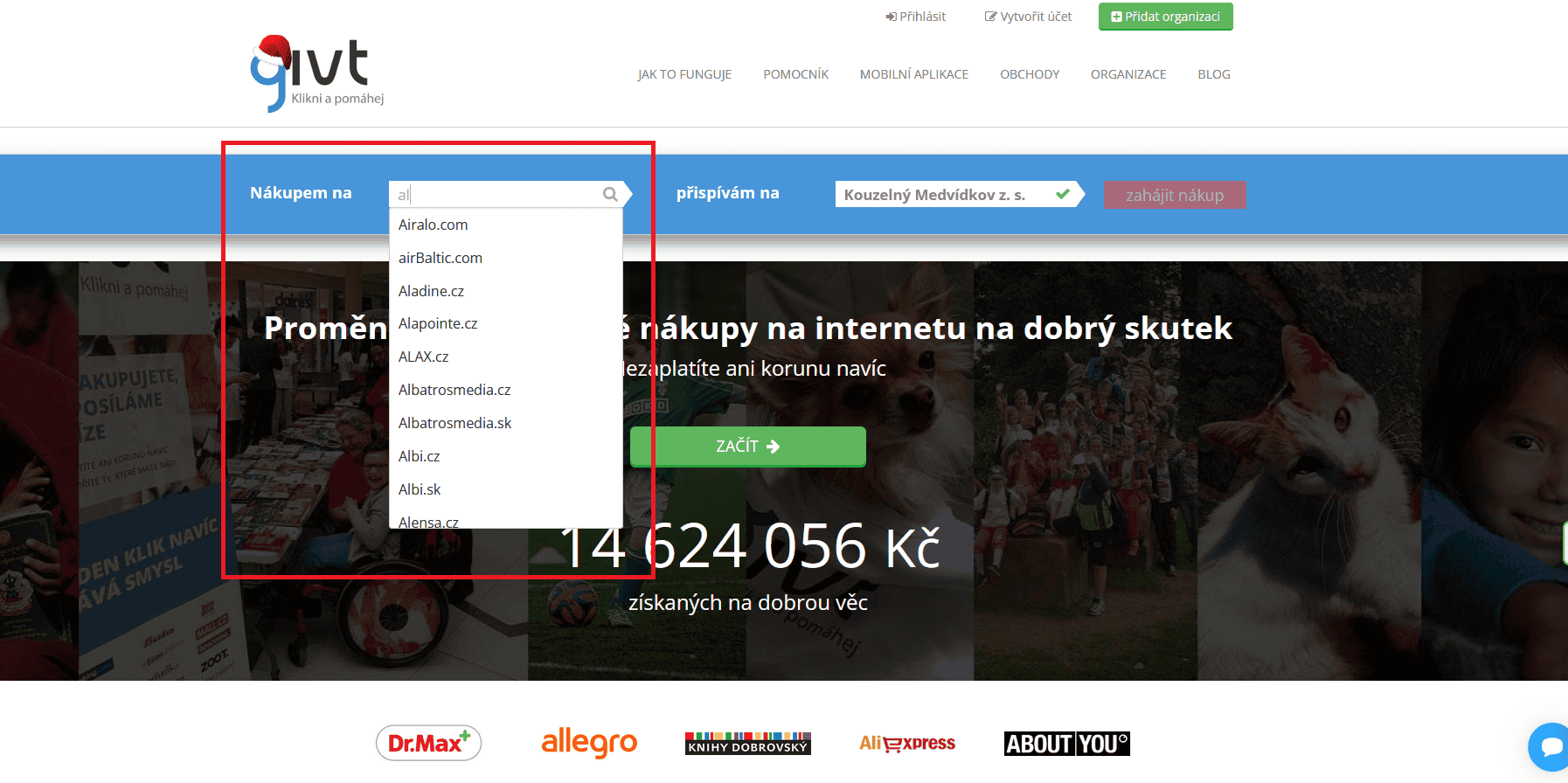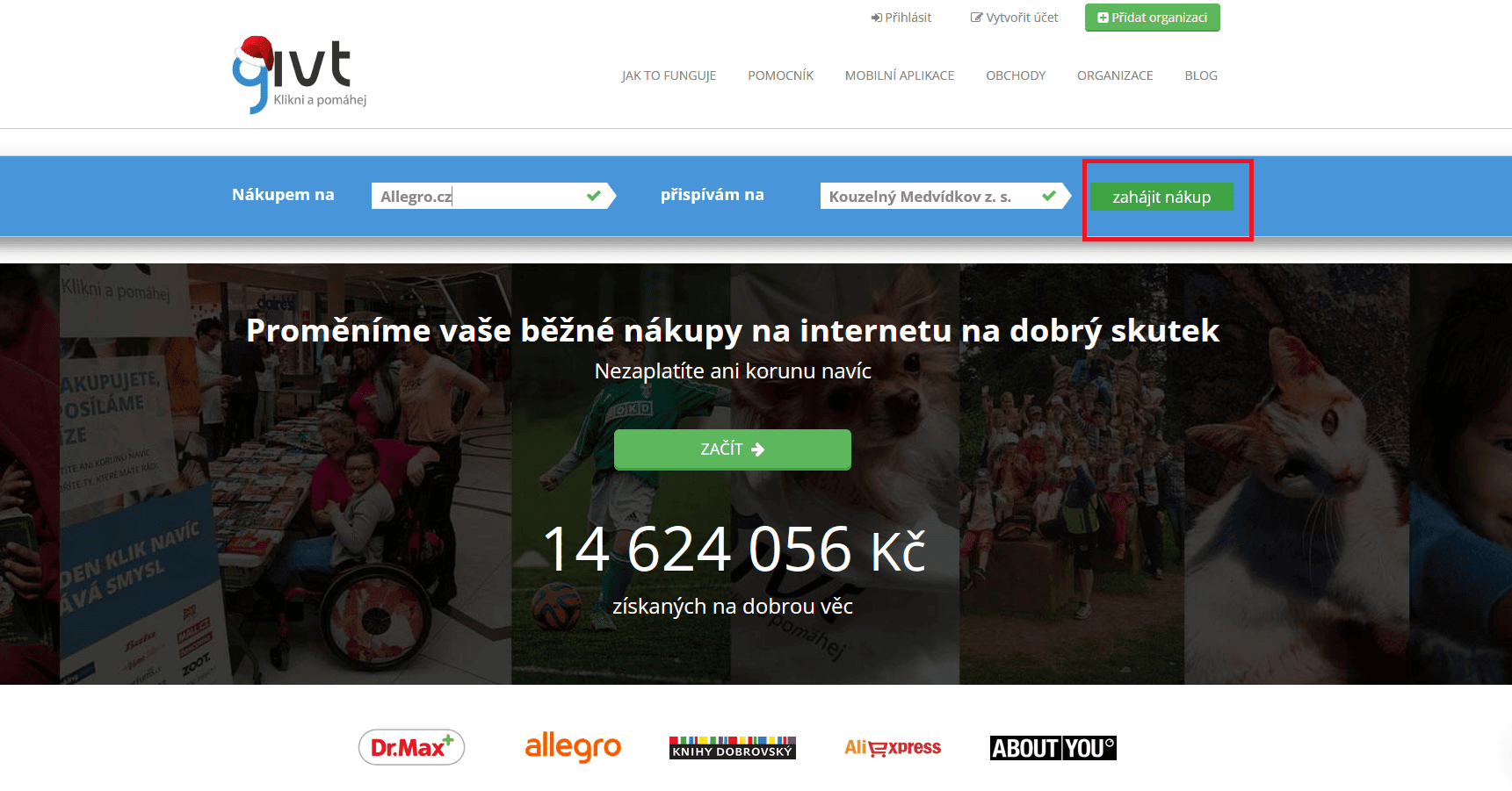 Poté, co jste vybrali obchod (v našem příkladu Allegro.cz) a potvrdili náš spolek, klikněte na modré tlačítko „zahájit nákup“ (v obrázku v červeném rámečku).