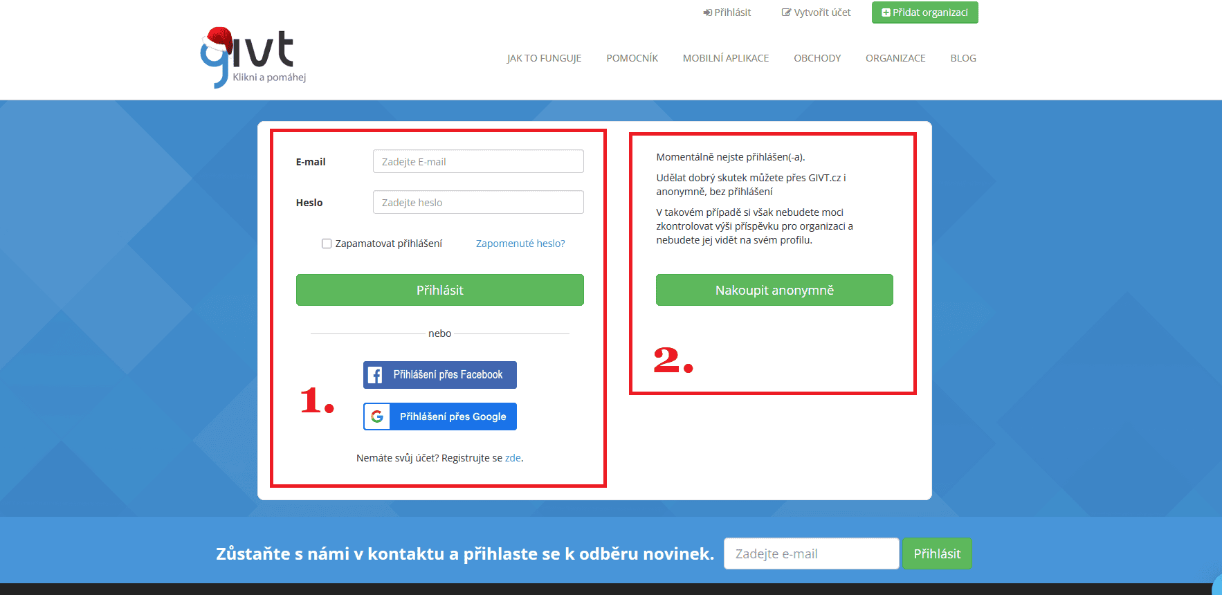 Objeví se Vám okno pro přihlášení do Vašeho GIVT účtu. Doporučujeme se přihlásit (1.) – tak budete mít přehled o tom, kolik jste nám pomohli získat.