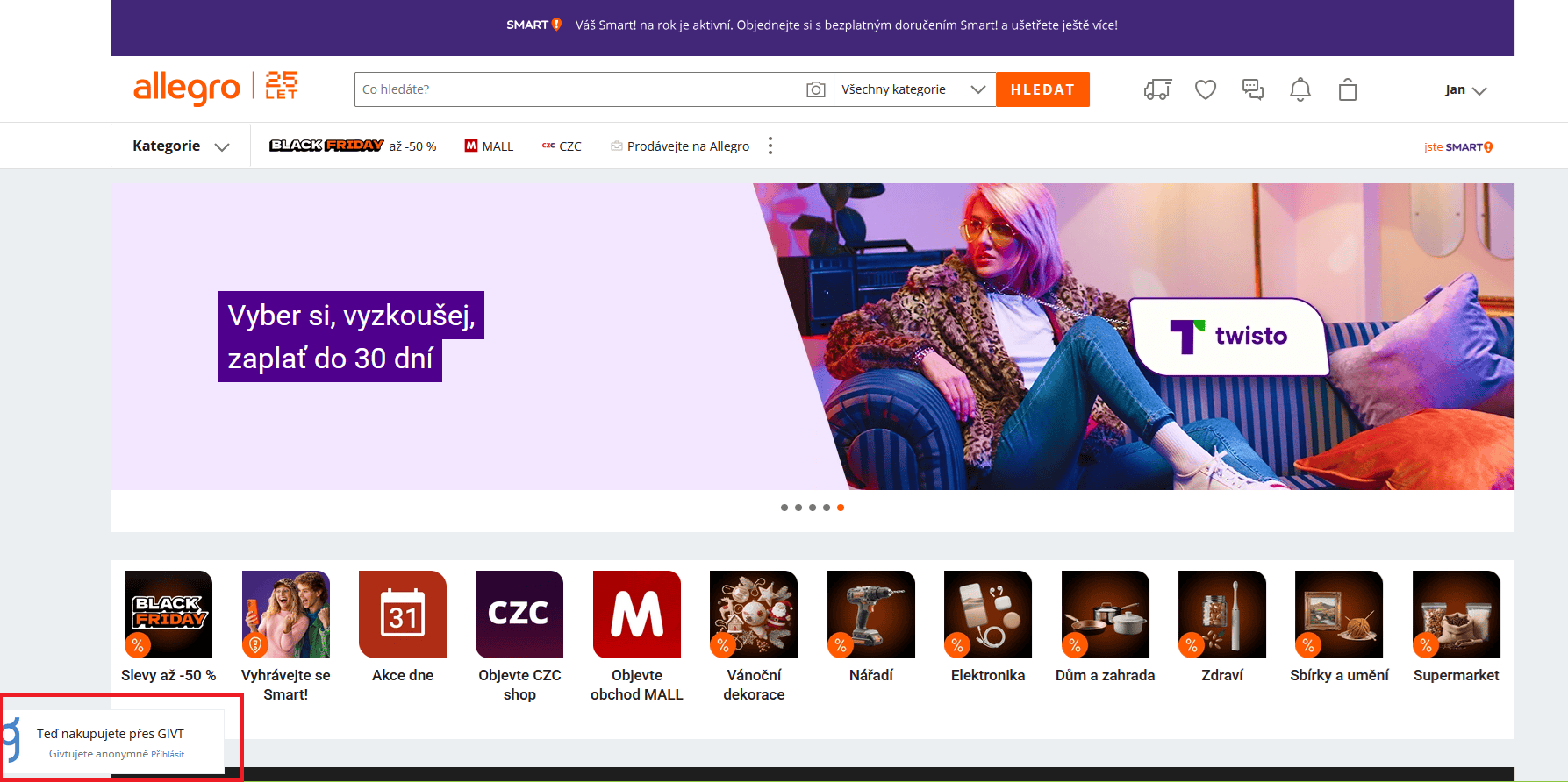 Nyní jste přesměrováni do obchodu. V levém dolním rohu obrazovky uvidíte malé oznámení, že nyní nakupujete přes GIVT.
